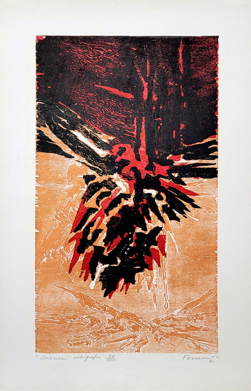 Litografía en rojo y negro. Imagen vertical en negro con mancha roja en el centro hacia arriba. Firmado en la matriz