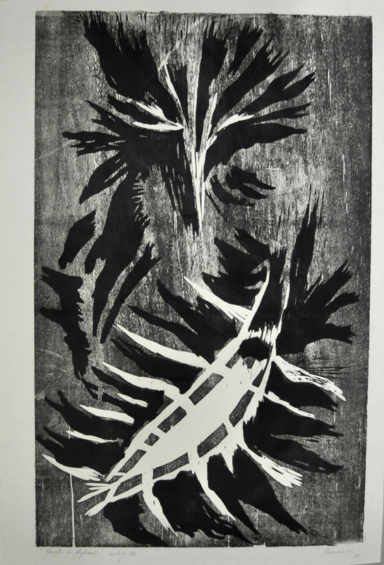 Xilografía en negro. Formas abstractas en blando con manchas en negro saliendo hacia los lados y fondo negro